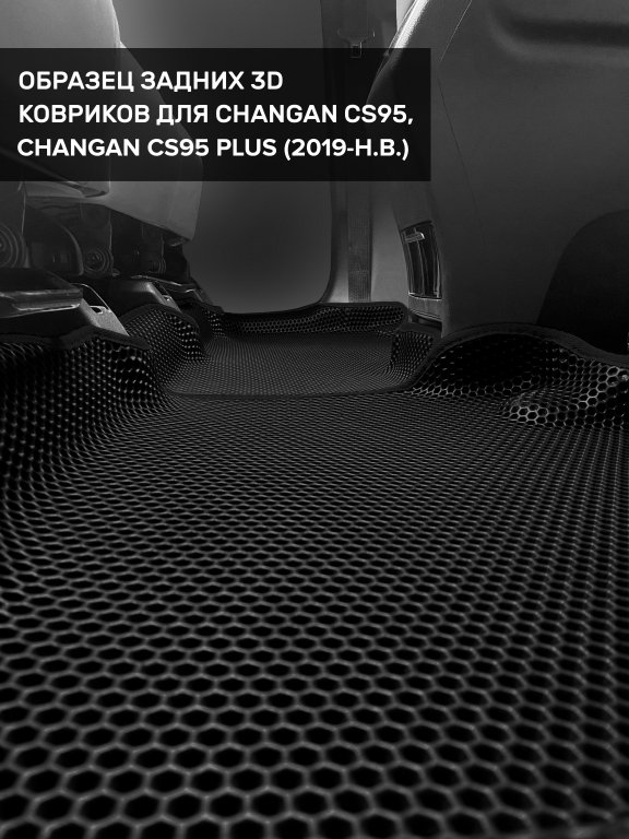 Автомобильные 3д коврики для Changan CS95 (2019-н.в.) в салон авто и багажник сделаны из инновационного полимерного материала EVA, изысканная структура в виде ячеек не дает воде, пыли и снегу разлетаться по салону машины и багажнику. 3д коврики зафиксированы на полу определенными клипсами, соответствующими Changan CS95 (2019-н.в.), и не двигаются в процессе езды.