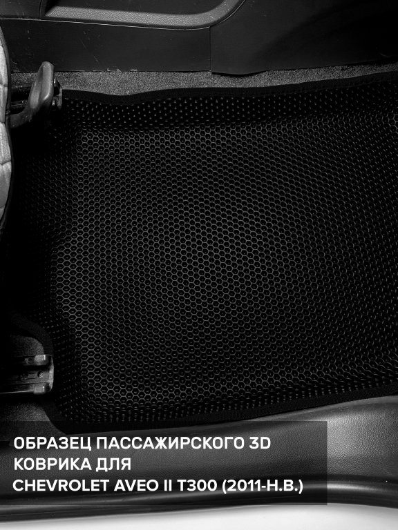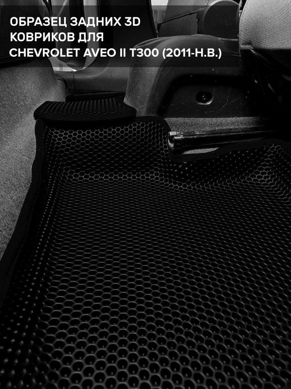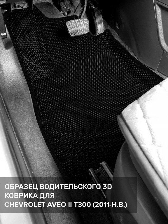 Автомобильные 3д коврики для Chevrolet Aveo II T300 (2011-н.в.) в салон авто и багажник сделаны из инновационного полимерного материала EVA, изысканная структура в виде ячеек не дает воде, пыли и снегу разлетаться по салону машины и багажнику. 3д коврики зафиксированы на полу определенными клипсами, соответствующими Chevrolet Aveo II T300 (2011-н.в.), и не двигаются в процессе езды.