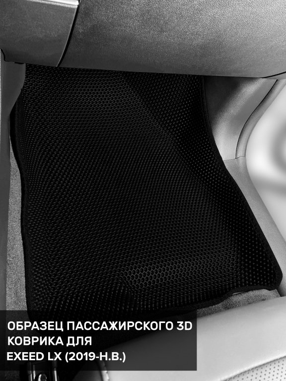 Автомобильные 3д коврики для EXEED LX (2019-н.в.) в салон авто и багажник сделаны из инновационного полимерного материала EVA, изысканная структура в виде ячеек не дает воде, пыли и снегу разлетаться по салону машины и багажнику. 3д коврики зафиксированы на полу определенными клипсами, соответствующими EXEED LX (2019-н.в.), и не двигаются в процессе езды.