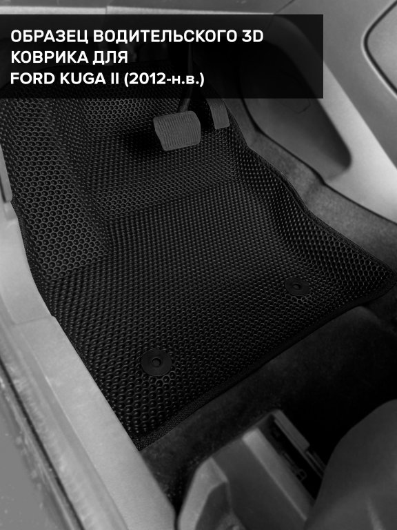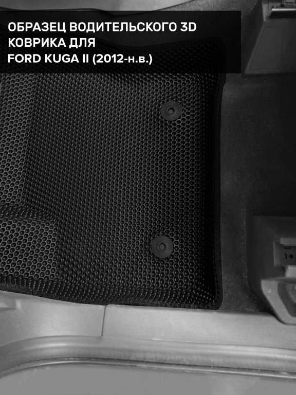 Автомобильные 3д коврики для Ford Kuga II (2012-н.в.) в салон авто и багажник сделаны из инновационного полимерного материала EVA, изысканная структура в виде ячеек не дает воде, пыли и снегу разлетаться по салону машины и багажнику. 3д коврики зафиксированы на полу определенными клипсами, соответствующими Ford Kuga II (2012-н.в.), и не двигаются в процессе езды.