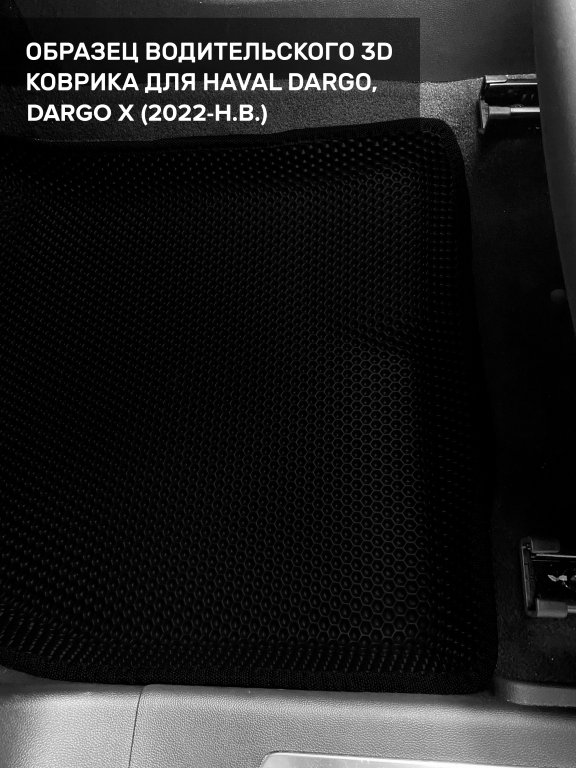 Автомобильные 3д коврики для Haval Dargo X (2022-н.в.) в салон авто и багажник сделаны из инновационного полимерного материала EVA, изысканная структура в виде ячеек не дает воде, пыли и снегу разлетаться по салону машины и багажнику. 3д коврики зафиксированы на полу определенными клипсами, соответствующими Haval Dargo X (2022-н.в.), и не двигаются в процессе езды.
