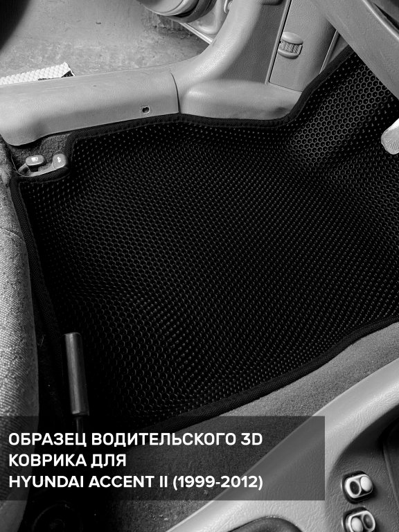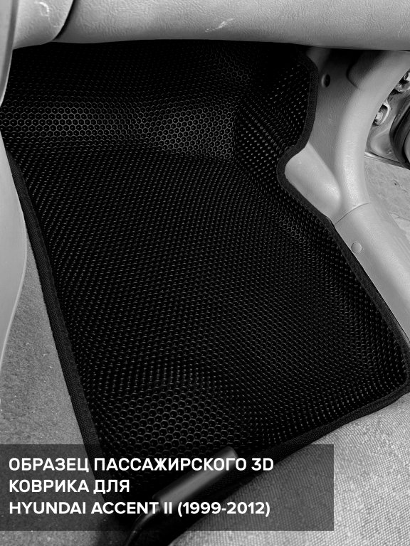 Автомобильные 3д коврики для Hyundai Accent II (1999-2012) в салон авто и багажник сделаны из инновационного полимерного материала EVA, изысканная структура в виде ячеек не дает воде, пыли и снегу разлетаться по салону машины и багажнику. 3д коврики зафиксированы на полу определенными клипсами, соответствующими Hyundai Accent II (1999-2012), и не двигаются в процессе езды.