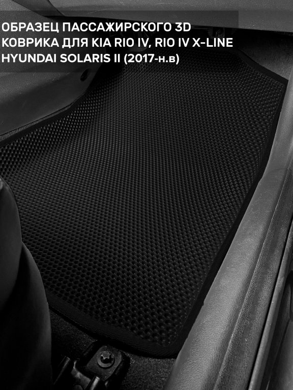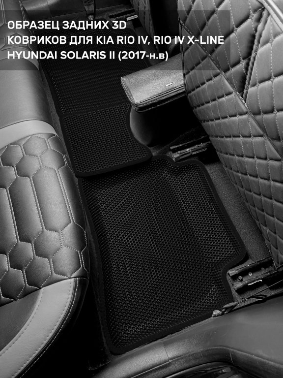 Автомобильные 3д коврики для Kia Rio IV (2017-н.в.) в салон авто и багажник сделаны из инновационного полимерного материала EVA, изысканная структура в виде ячеек не дает воде, пыли и снегу разлетаться по салону машины и багажнику. 3д коврики зафиксированы на полу определенными клипсами, соответствующими Kia Rio IV (2017-н.в.), и не двигаются в процессе езды.