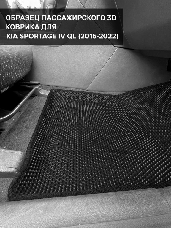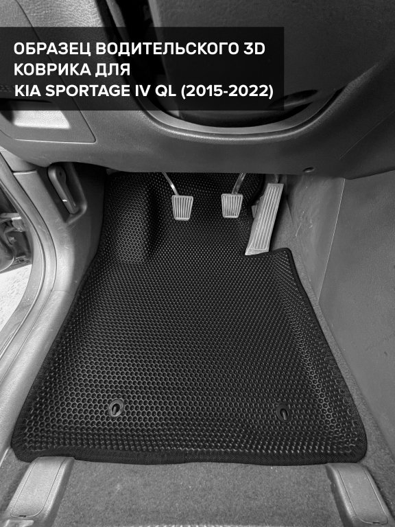 Автомобильные 3д коврики для Kia Sportage IV QL (2015-2022) в салон авто и багажник сделаны из инновационного полимерного материала EVA, изысканная структура в виде ячеек не дает воде, пыли и снегу разлетаться по салону машины и багажнику. 3д коврики зафиксированы на полу определенными клипсами, соответствующими Kia Sportage IV QL (2015-2022), и не двигаются в процессе езды.