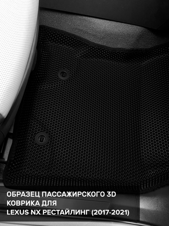 Автомобильные 3д коврики для Lexus NX (2014-2021) в салон авто и багажник сделаны из инновационного полимерного материала EVA, изысканная структура в виде ячеек не дает воде, пыли и снегу разлетаться по салону машины и багажнику. 3д коврики зафиксированы на полу определенными клипсами, соответствующими Lexus NX (2014-2021), и не двигаются в процессе езды.