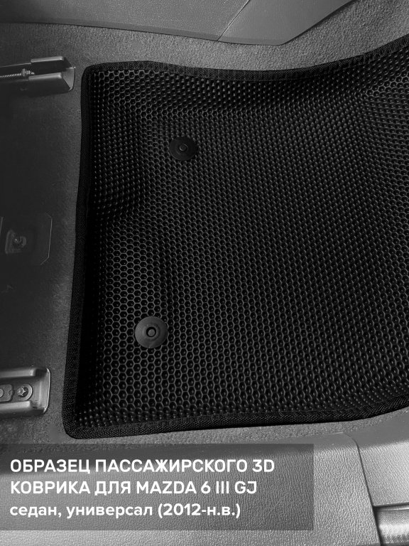 Автомобильные 3д коврики для Mazda 6 III GJ седан, универсал (2012-н.в.) в салон авто и багажник сделаны из инновационного полимерного материала EVA, изысканная структура в виде ячеек не дает воде, пыли и снегу разлетаться по салону машины и багажнику. 3д коврики зафиксированы на полу определенными клипсами, соответствующими Mazda 6 III GJ седан, универсал (2012-н.в.), и не двигаются в процессе езды.