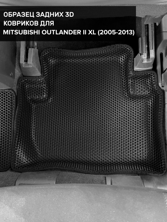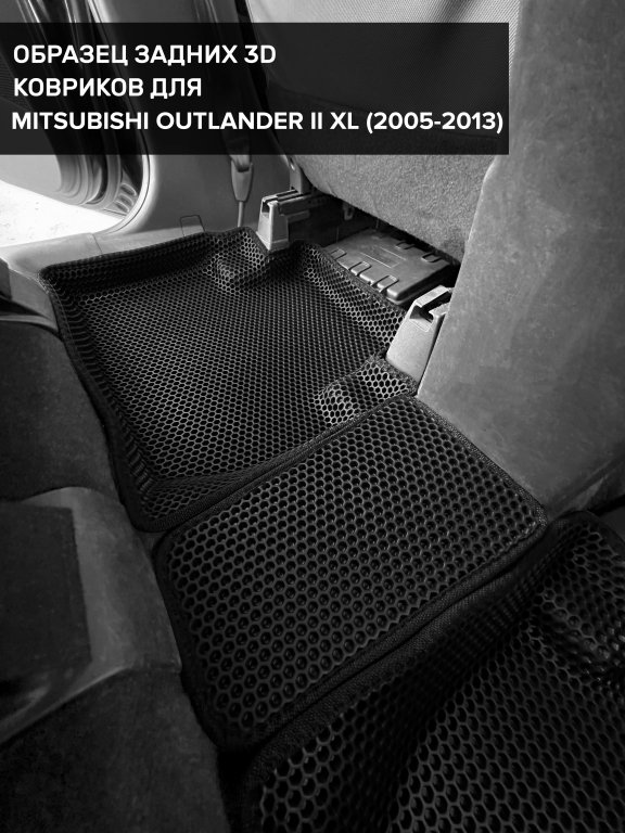 Автомобильные 3д коврики для Mitsubishi Outlander II XL (2005-2013) в салон авто и багажник сделаны из инновационного полимерного материала EVA, изысканная структура в виде ячеек не дает воде, пыли и снегу разлетаться по салону машины и багажнику. 3д коврики зафиксированы на полу определенными клипсами, соответствующими Mitsubishi Outlander II XL (2005-2013), и не двигаются в процессе езды.