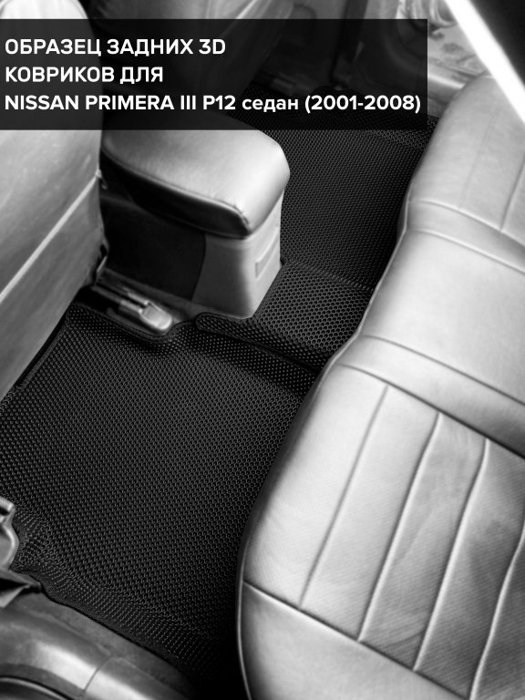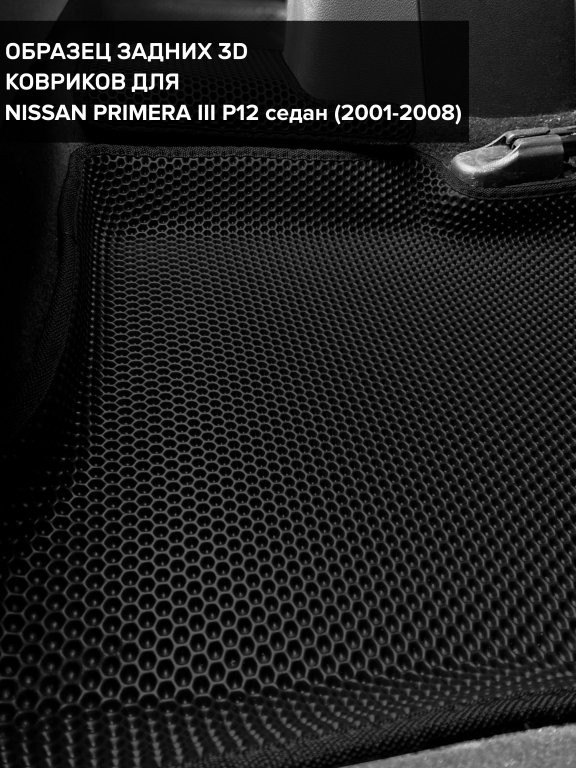 Автомобильные 3д коврики для Nissan Primera III P12 (2001-2008) в салон авто и багажник сделаны из инновационного полимерного материала EVA, изысканная структура в виде ячеек не дает воде, пыли и снегу разлетаться по салону машины и багажнику. 3д коврики зафиксированы на полу определенными клипсами, соответствующими Nissan Primera III P12 (2001-2008), и не двигаются в процессе езды.