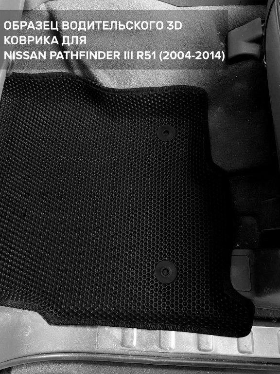 Автомобильные 3д коврики для Nissan Pathfinder III R51 7 мест (2004-2014) в салон авто и багажник сделаны из инновационного полимерного материала EVA, изысканная структура в виде ячеек не дает воде, пыли и снегу разлетаться по салону машины и багажнику. 3д коврики зафиксированы на полу определенными клипсами, соответствующими Nissan Pathfinder III R51 7 мест (2004-2014), и не двигаются в процессе езды.