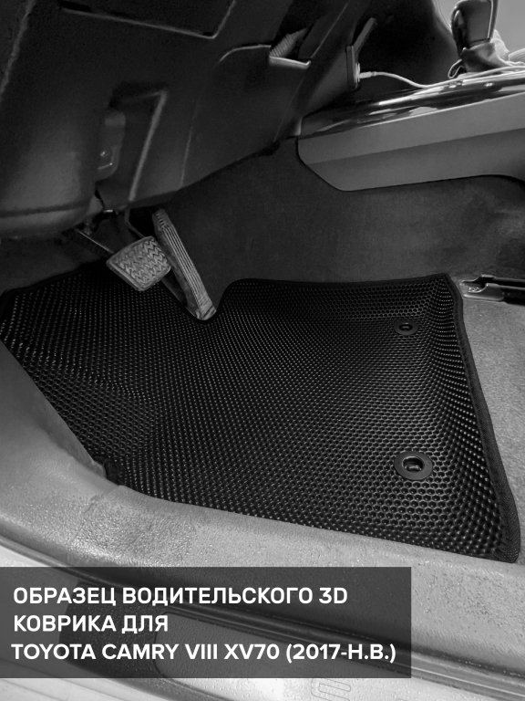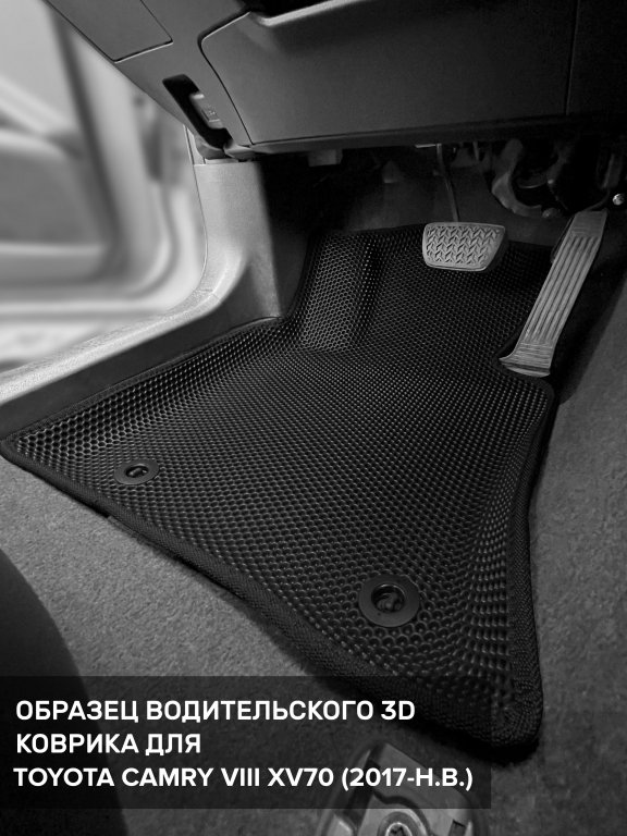 Автомобильные 3д коврики для Toyota Camry VIII XV70 (2017-н.в.) в салон авто и багажник сделаны из инновационного полимерного материала EVA, изысканная структура в виде ячеек не дает воде, пыли и снегу разлетаться по салону машины и багажнику. 3д коврики зафиксированы на полу определенными клипсами, соответствующими Toyota Camry VIII XV70 (2017-н.в.), и не двигаются в процессе езды.